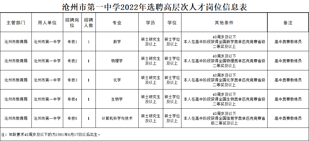 为深入实施“人才强市”战略,进一步加大高层次人才引进力度,根据《事业单位人事管理条例》《河北省事业单位公开招聘工作人员暂行办法》《沧州市事业单位公开招聘工作人员实施办法(试行)》文件精神及沧州市人才强市具体工作要求,结合我校教学科研工作需要,经研究决定,拟采取选聘方式引进高层次人才5名。