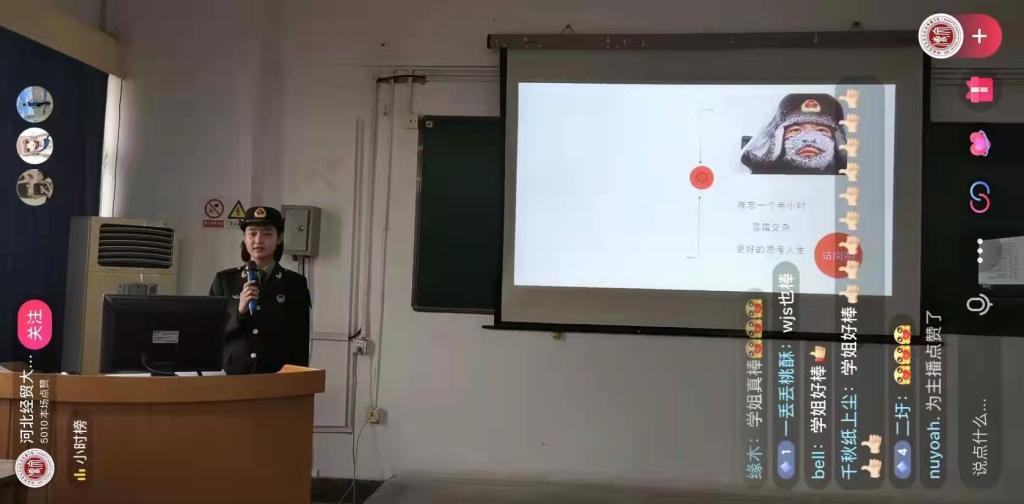 田惠珍同学围绕“军旅生活,无限荣誉”为主题,从入伍初衷、军旅生活及退役相关政策等方面做了汇报。活动最后,田惠珍同学与同学们在直播间展开了积极地互动,详细解答了同学们关心的“如何征兵入伍”“入伍之后是否可以报考军校”等问题。