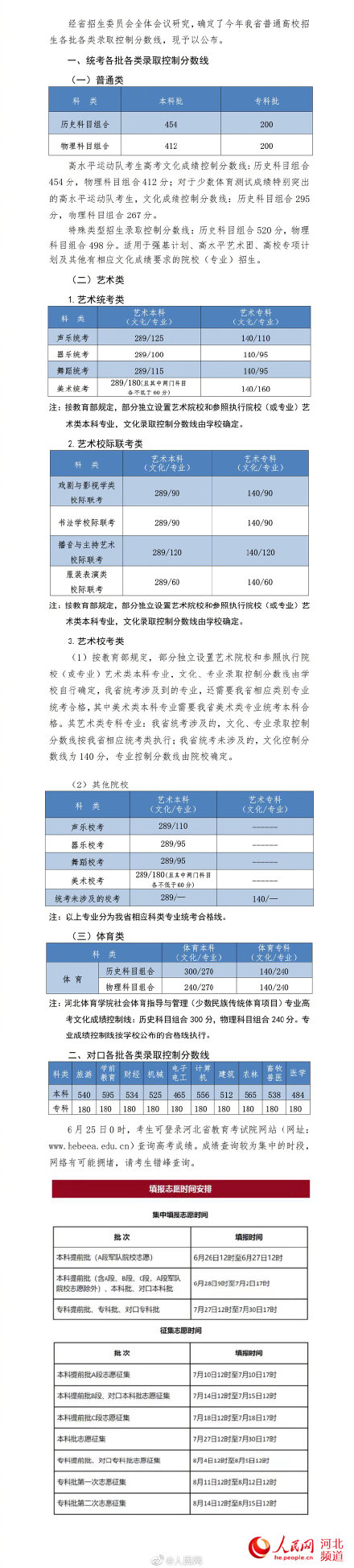 2021高考各地分数线【2021河北高考分数线出炉】普通类历史科目组合:本科批454分,专科批200分;普通类物理科目组合:本科批412分,专科批200分。(人民网河北频道)