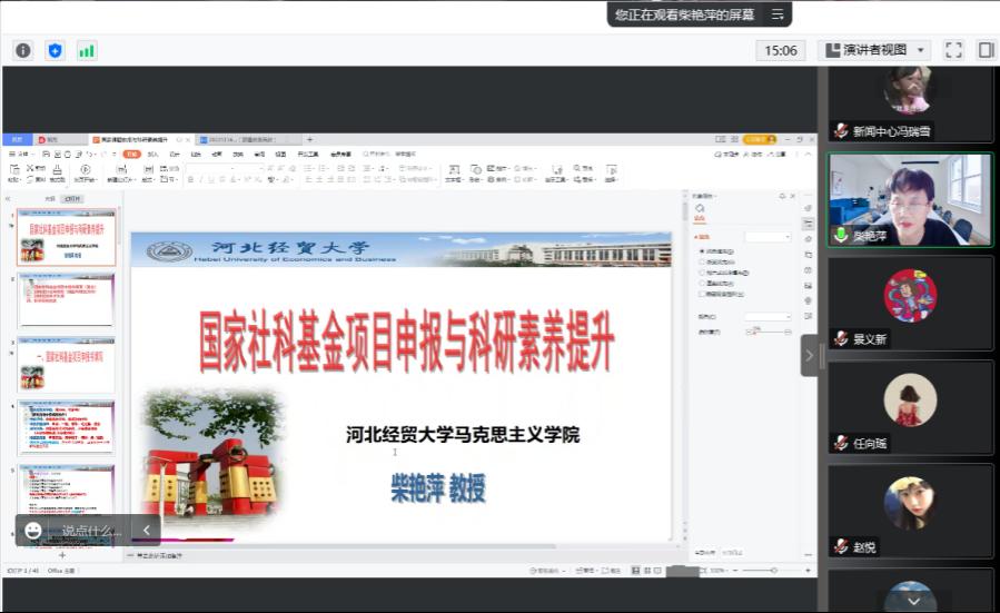 11月21日下午,文化与传播学院邀请马克思主义学院院长柴艳萍作题为“国家社科基金项目申报与科研素养提升”的“双百论坛”线上学术讲座。讲座由文化与传播学院院长景义新主持,多个学院师生90余人参加。