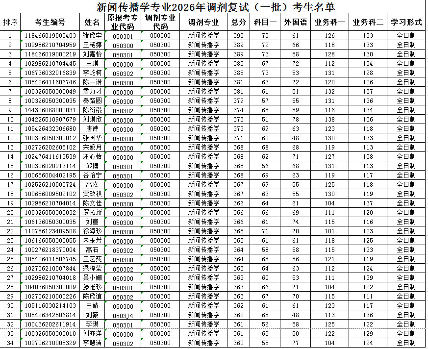 新闻传播学专业2026年调剂复试(第一批)考生名单
