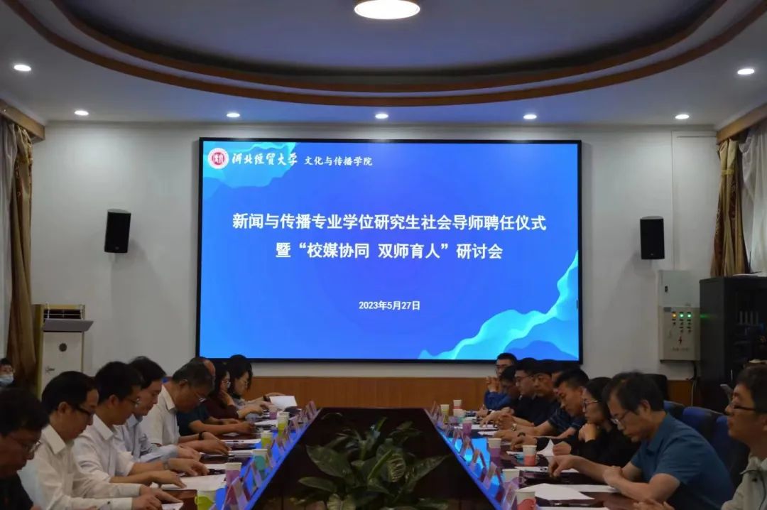 5月27日下午,文化与传播学院在学校第二会议室举办新闻与传播专业学位研究生社会导师聘任仪式暨“校媒协同,双师育人”研讨会。校党委副书记刘建平出席并为社会导师颁发聘书,来自国家、省、市、县四级媒体的23位资深媒体工作者参加聘任仪式。文化与传播学院党委书记蔡金续、院长景义新、副院长马兴祥以及全体专硕研究生导师等40余人参会。