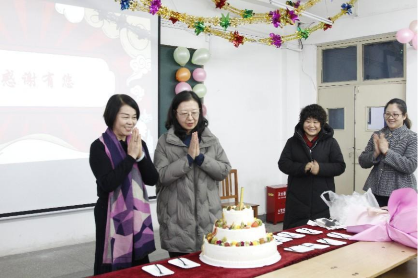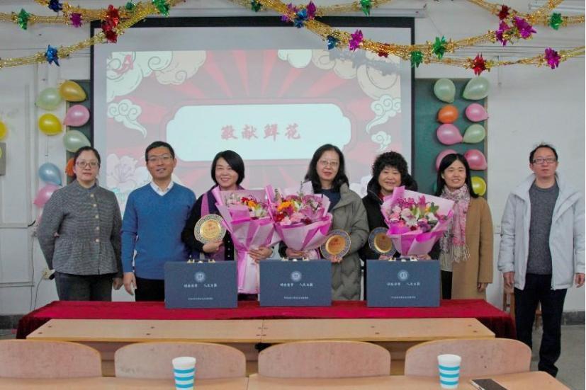 在热烈的掌声中,学院领导为到场的三位荣休教师送上鲜花和纪念礼品并合影留念。参会教师们齐声为退休教师送上“荣休快乐!”祝福。