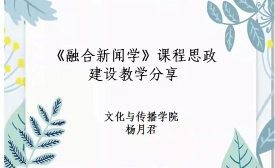 杨月君围绕其讲授的《融合新闻学》课程思政的申报和教学实践,针对《高等学校课程思政建设指导纲要》的具体实施从“为什么”“是什么”“做什么”“怎么做”“谁来做”五个方面进行了详细介绍,《融合新闻学》的课程思政结合了专业特点,充分挖掘、梳理课程思政资源,更好发挥课堂育人主渠道,提高了学生的专业素养。