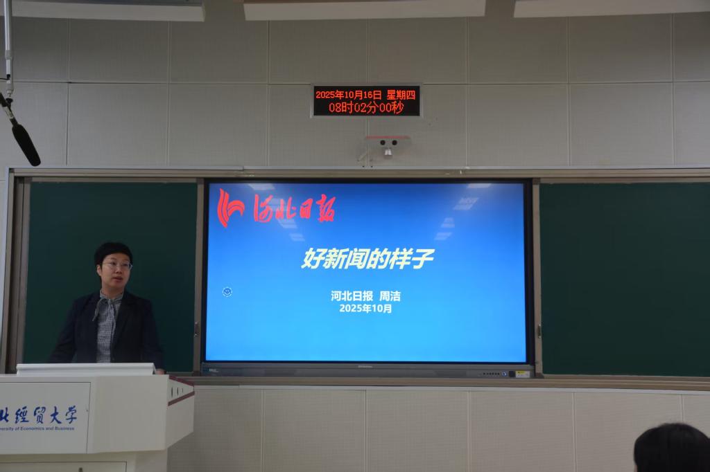 10月16日上午,色情视频 邀请河北日报石家庄分社副社长周洁在B教308教室开展主题为“好新闻的样子”的讲座,新闻传播学专业60余名学生参加。