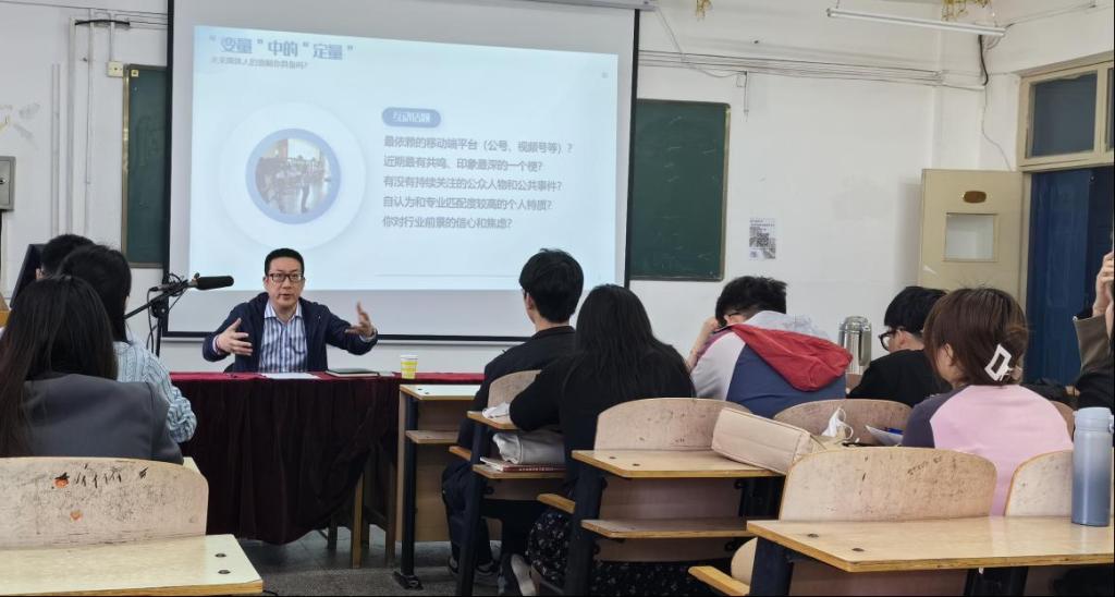 讲座伊始,韩涛与同学们就媒体认知、专业发展、网络舆情等话题进行互动。韩涛认为,新时代面临多种变量,技术、媒介、分众、舆情、生存环境、超体等重要“变量”都会对传播产生影响,尤其进入智能时代,媒体面临法治、社会、技术等多重挑战,媒体人一定要在变量中认清定量,进一步提升专业能力,创造出更多优质内容。