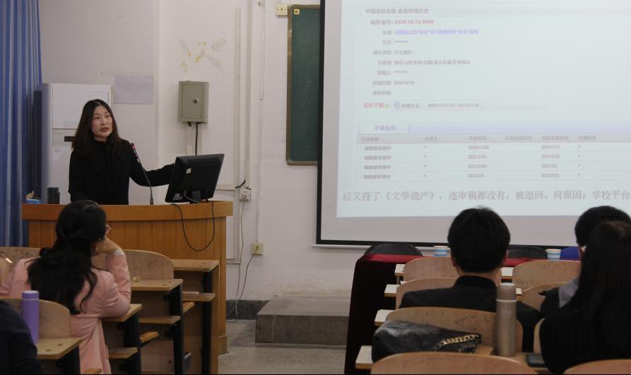 廉水杰围绕省社科基金项目“王通经典视域下颜延之的风雅精神研究”所做的研究及系列成果发表进行经验分享。她从论文撰写、论文投稿、论文发表及项目结项四个方面进行细致讲解,并以投稿《文学遗产》《安徽师范大学学报》《中国文艺评论》等期刊为例,分享了论文发表的成败经历,并讲述了地方院校文学类专业青年教师发表高层次论文所面临的困境。关于论文发表流程,廉水杰指出最关键的环节是编辑初审和编辑部讨论,其次是之后的外审,为节省文章发表时间,一定要仔细研究学术期刊的特点,除了论文主题与期刊选题一致外,还要注意期刊的文章风格,有期刊强调学术价值,有期刊注重论文文采,一定要根据自身情况合理选择期刊。针对项目结项,她分享了如何合理把控研究进度、研究的阶段性成果与最终成果的认定等具体经验。