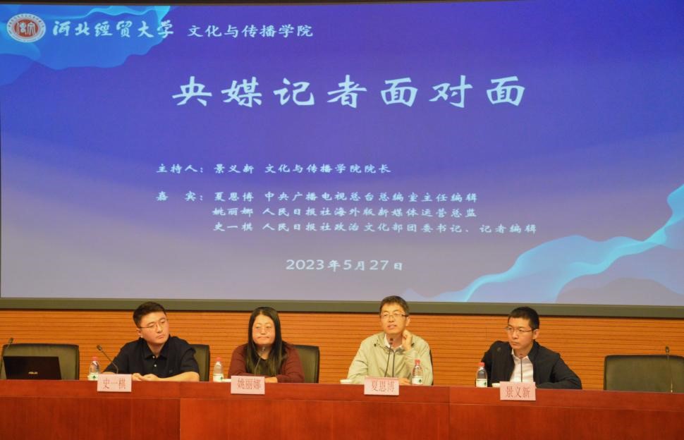 5月27日上午,文化与传播学院邀请中央广播电视总台总编室主任编辑夏恩博,人民日报社海外版新媒体运营总监姚丽娜及人民日报社政治文化部团委书记史一棋在国际学术报告厅作“央媒记者面对面”讲座,文化与传播学院院长景义新主持,学院100余名学生参加。