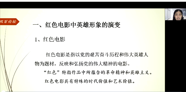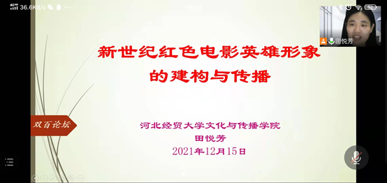 举办“双百论坛”,田悦芳教授以“新世纪红色电影英雄形象的建构与传播”为题做线上报告。学院部分教师、学生共80余人参加。