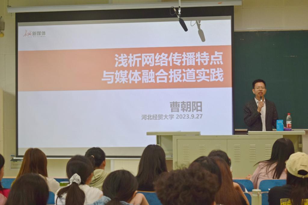 9月27日下午,色情视频 邀请长城新媒体集团时政新闻部、融媒体制作部主任曹朝阳在第三教学楼C310教室作学术讲座,主题为“浅析网络传播特点与媒体融合报道实践”,讲座由院长景义新主持,学院师生120余人参加。