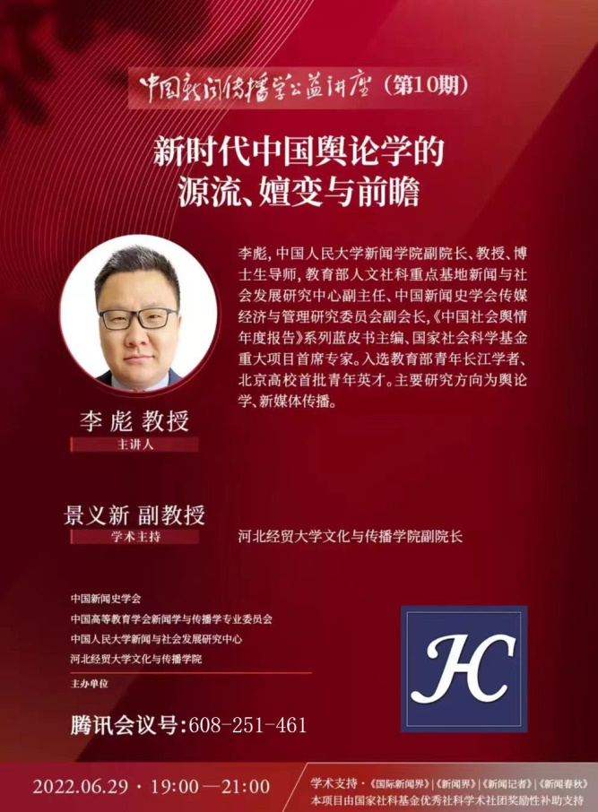 文化与传播学院共同主办的中国新闻传播学公益讲座第十期在腾讯会议线上举行。中国人民大学李彪教授作题为“新时代中国舆论学的源流、嬗变和前瞻”的学术讲座。讲座由文化与传播学院副院长景义新主持,新闻传播学专业教师和学生共300人参加,并通过网络方式同步直播。