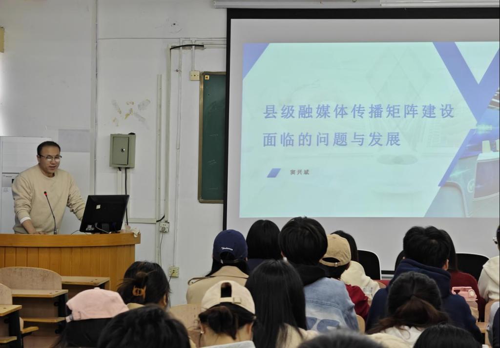 副教授窦兴斌以“县级融媒体传播矩阵建设面临的问题与发展路径分析”为主题作学术分享,新闻传播学专业教师、研究生共60余人参加。