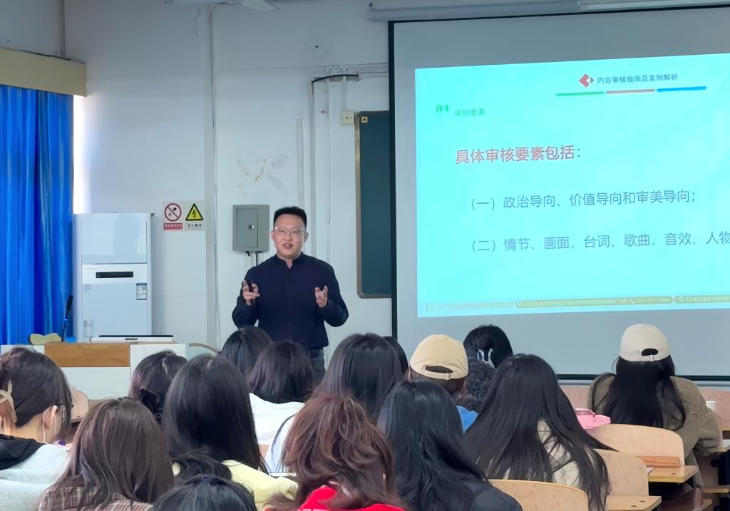 讲座伊始,朱秋杉通过结合《六姊妹》《北上》《哪吒》等当下热播影视介绍了网络视听节目这一大概念,并引出本次讲座主题即对网络视听节目的内容审核。朱秋杉强调了审核工作在媒体行业中的重要性,借此让同学们了解到内容审核的安全性能,希望这些经验能够给对此感兴趣的学生有所帮助。