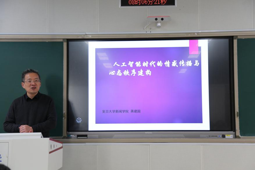 主办的新闻与传播理论前沿论坛第10讲在B教308教室举行。复旦大学新闻学院蒋建国教授应邀作题为“人工智能时代的情感传播与社会心态秩序建构”的学术讲座,新闻传播学相关专业师生共60余人参加。